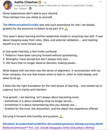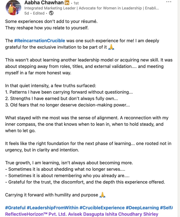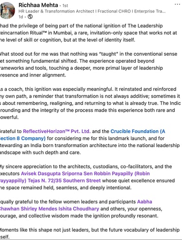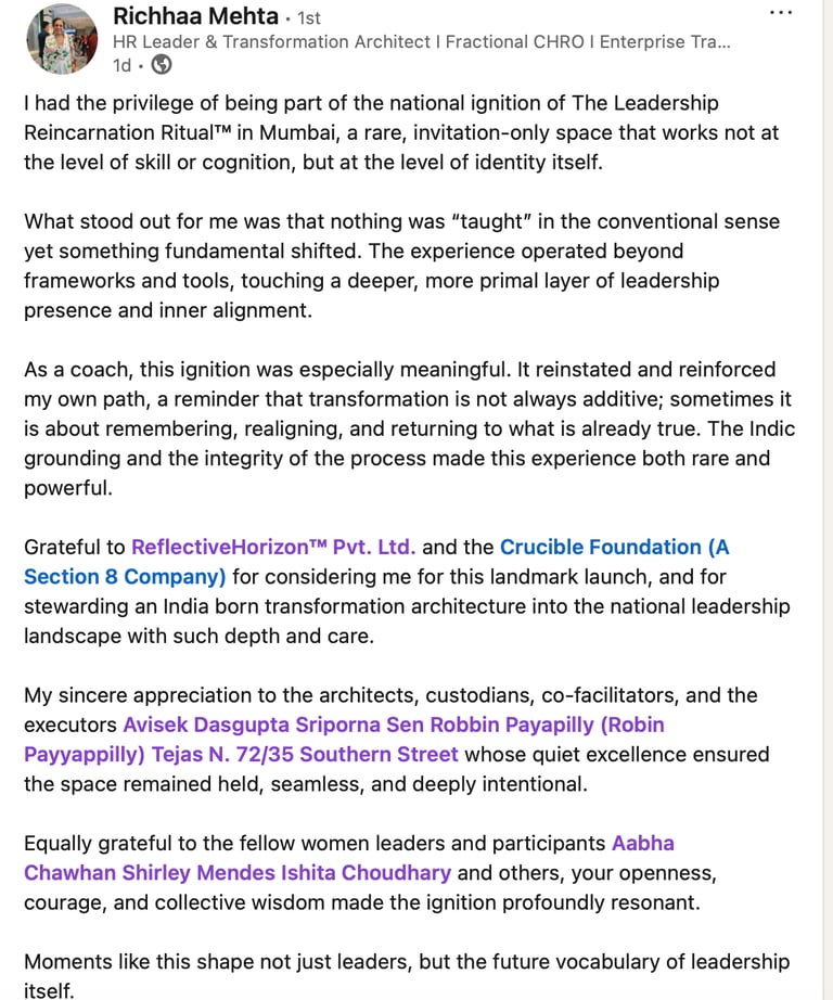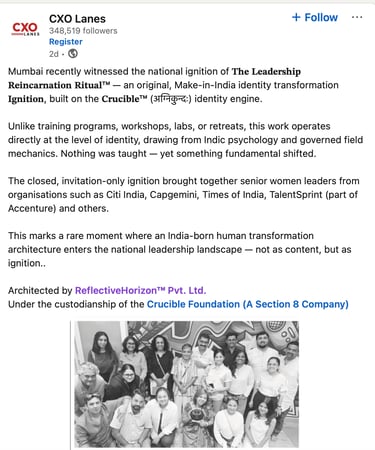 This is the second activation of The Leadership Reincarnation Ritual™ — a one-day, identity ignition held in a contained, governed field.